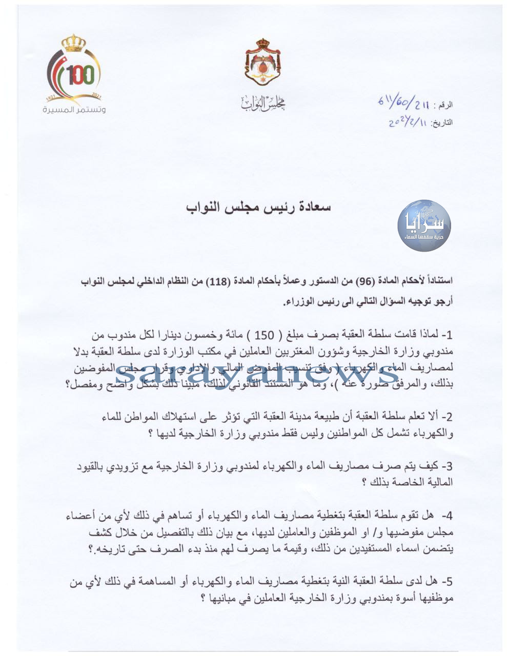 1- لماذا قامت سلطة العقبة بصرف مبلغ ( 150 ) مائة وخمسون دينارا لكل مندوب من مندوبي وزارة الخارجية وشؤون المغتربين العاملين في مكتب الوزارة لدى سلطة العقبة بدلا لمصاريف الماء والكهرباء ( وفق تنسيب المفوض المالي والإداري وقرار مجلس المفوضين بذلك، والمرفق صورة عنه )، وما هو المستند القانوني لذلك، مبينا ذلك بشكل واضح ومفصل؟