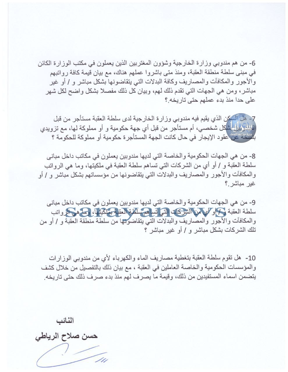 5- هل لدى سلطة العقبة النية بتغطية مصاريف الماء والكهرباء أو المساهمة في ذلك لأي من موظفيها أسوة بمندوبي وزارة الخارجية العاملين في مبانيها ؟
