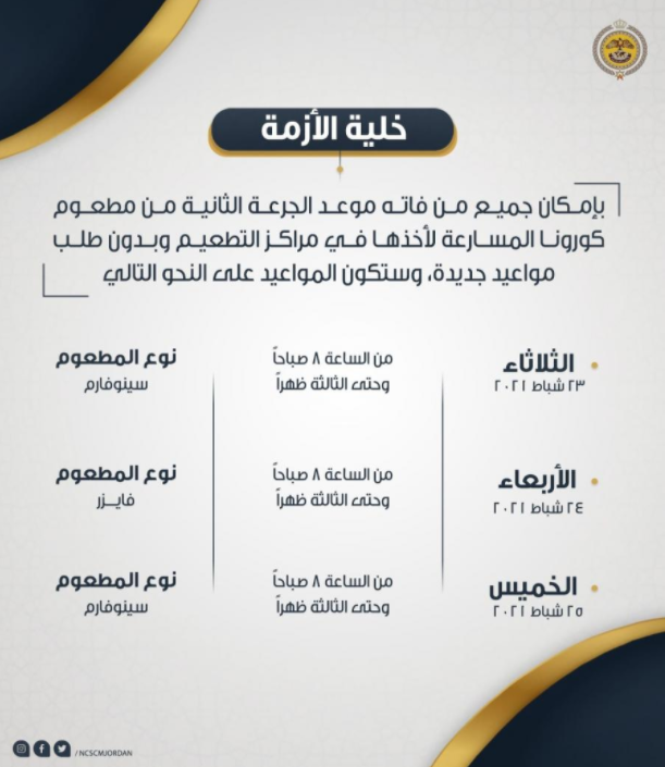 يذكر أن خلية الأزمة حددت هذه المواعيد لتسهيل تلقي الجرعة الثانية من المطعوم: