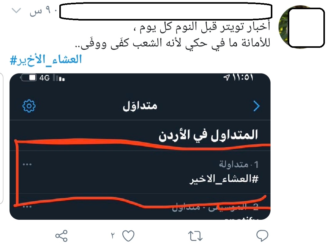 سرايا - تصدر هاشتاغ العشاء الأخير الترند في الأردن أمس، بعد إقالة وزيري الداخلية والعدل، على خلفية مخالفتهما لأوامر الدفاع، خلال مأدبة طعام تجاوزت العدد المسموح به.