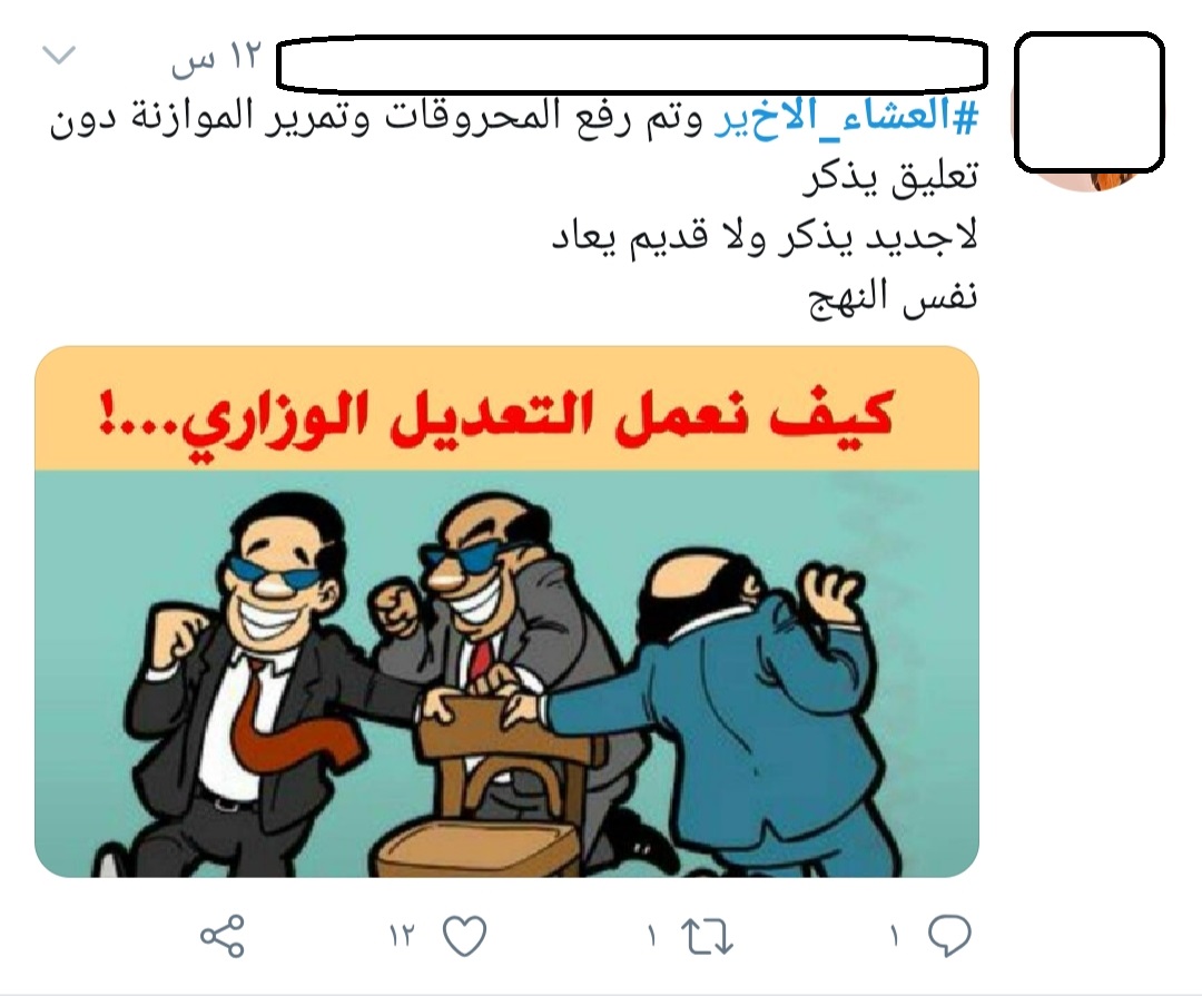 وتركزت تغريدات النشطاء على أن هذه الاستقالات جاءت لتغطية قضية أخرى، كارتفاع أسعار البترول، إضافة إلى تداولهم تواجد وزير ثالث برفقتهما لم يدرج اسمه مع الوزيرين، الأمر الذي نفته مصادر عديدة لسرايا، وكان جانب من التغريدات يرتكز على أن الوزيرين سيحلان بمناصب سيادية أخرى بعد فترة من الزمن.