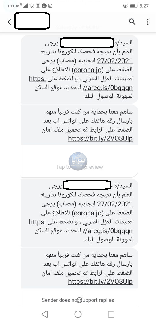وقالت المعلمة لسرايا، أن مديرة المدرسة تواصلت مع مدير تربية مأدبا، وطلبت منه إجازة لمدة أسبوعين للمعلمة، التي من الممكن في أي لحظة أن تصاب بكورونا، لأنها تشرف على رعاية أبنائها الـ3 في المنزل، إلا أنه رفض ذلك، وأخبرها أن تواصل دوامها بشكل رسمي.
