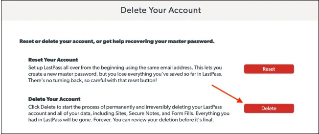 الآن، بعد تصدير بياناتك فقد ترغب في حذف حسابك وبياناتك في تطبيق LastPass إذا لم تكن تخطط للترقية أو الاستمرار في استخدام الخطة المجانية بعد تطبيق القيود الجديدة، وللقيام بذلك، اتبع الخطوات التالية: