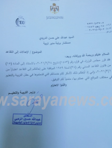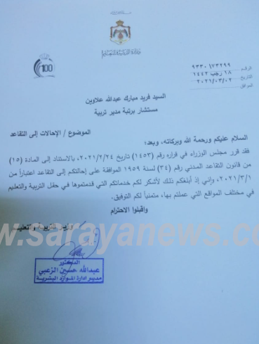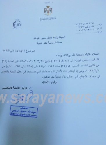 سرايا - قرر مجلس الوزراء في جلسته التي عقدها في الـ24 من شباط الماضي إحالة 3 مستشارين برتبة مدراء تربية لوزير التربية، الدكتور تيسير النعيمي للتقاعد، وفق وثائق حصلت عليها "سرايا".