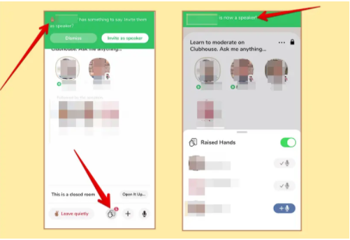 يرفع الناس أيديهم خلال الجلسة لأسباب مختلفة، إذا رأيت رسالة مفادها أن شخصًا ما قد طلب أن يكون متحدثًا في الغرفة، فيمكنك دعوته إلى المسرح أو رفض الرسالة أو عدم القيام بأي شيء، وفي هذه الحالة ستختفي الرسالة.