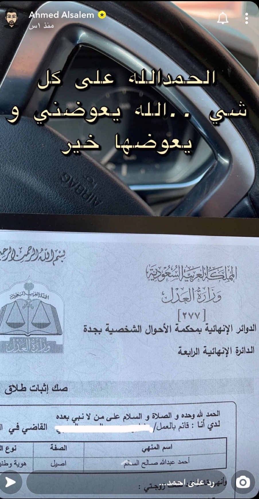 وعلق السالم على صورة وثيقة الطلاق: “الحمدلله على كل شيء.. الله يعوضني ويعوضها خيرا”.
