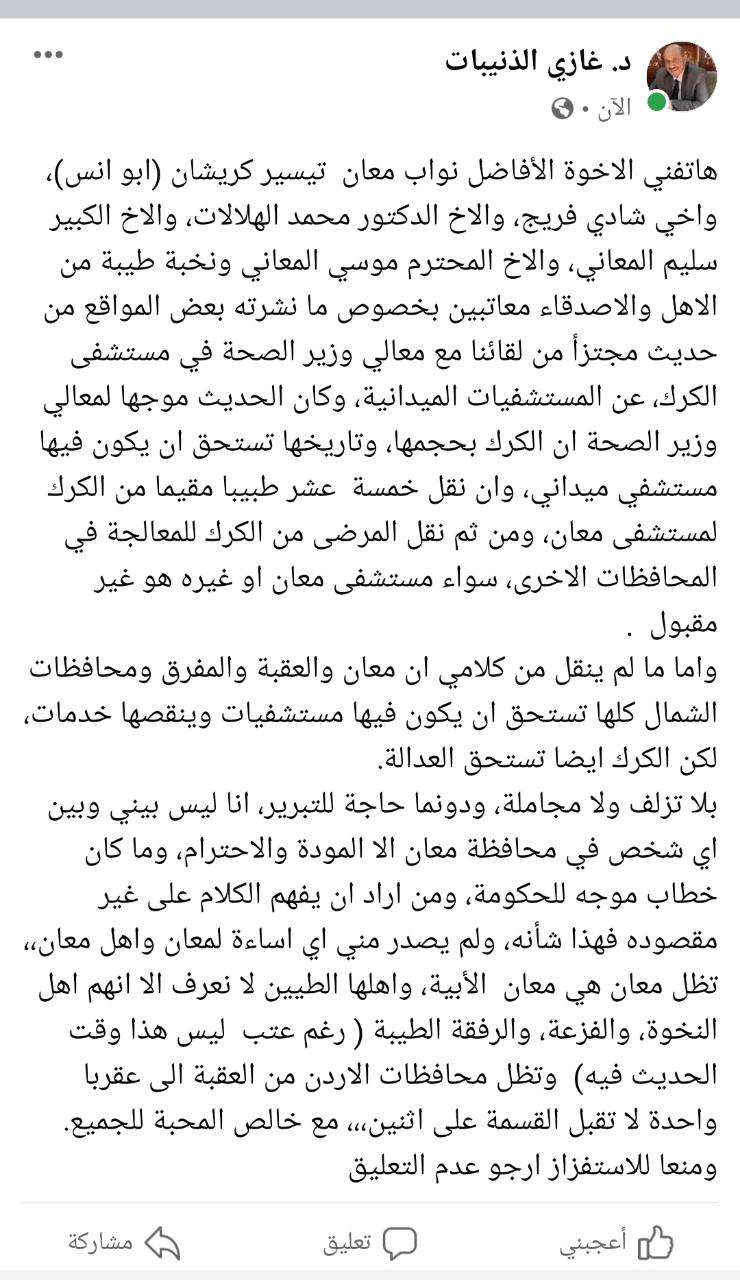 بلا تزلف ولا مجاملة، ودونما حاجة للتبرير، انا ليس بيني وبين اي شخص في محافظة معان الا المودة والاحترام، وما كان خطاب موجه للحكومة، ومن اراد ان يفهم الكلام على غير مقصوده فهذا شأنه، ولم يصدر مني اي اساءة لمعان واهل معان،، تظل معان هي معان الأبية، واهلها الطيين لا نعرف الا انهم اهل النخوة، والفزعة، والرفقة الطيبة ( رغم عتب ليس هذا وقت الحديث فيه) وتظل محافظات الاردن من العقبة الى عقربا واحدة لا تقبل القسمة على اثنين،،، مع خالص المحبة للجميع.