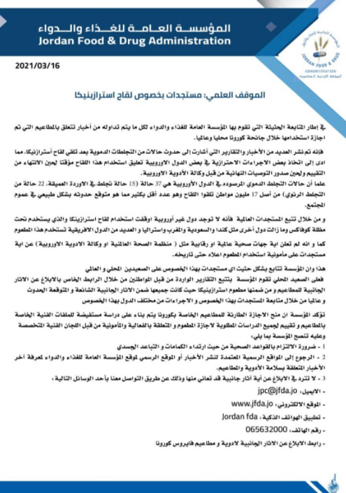 سرايا - أعلنت المؤسسة العامة للغذاء والدواء موقفها العلمي حول مستجدات لقاح استرازينيكا.