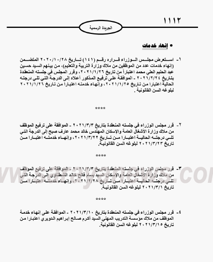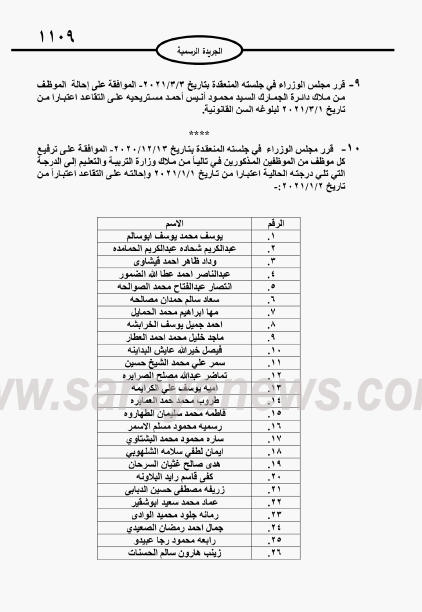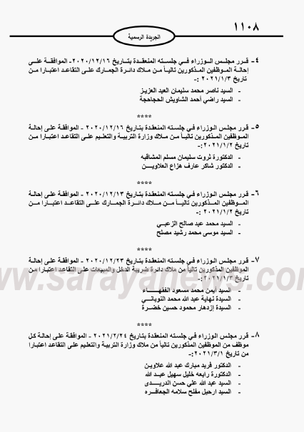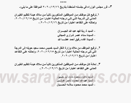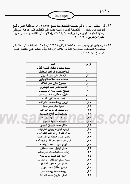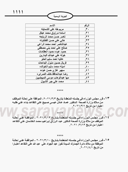 سرايا - قرر مجلس الوزراء إحالة موظفين في عدد من الوزارات والدوائر إلى التقاعد، وتالياً الاسماء: