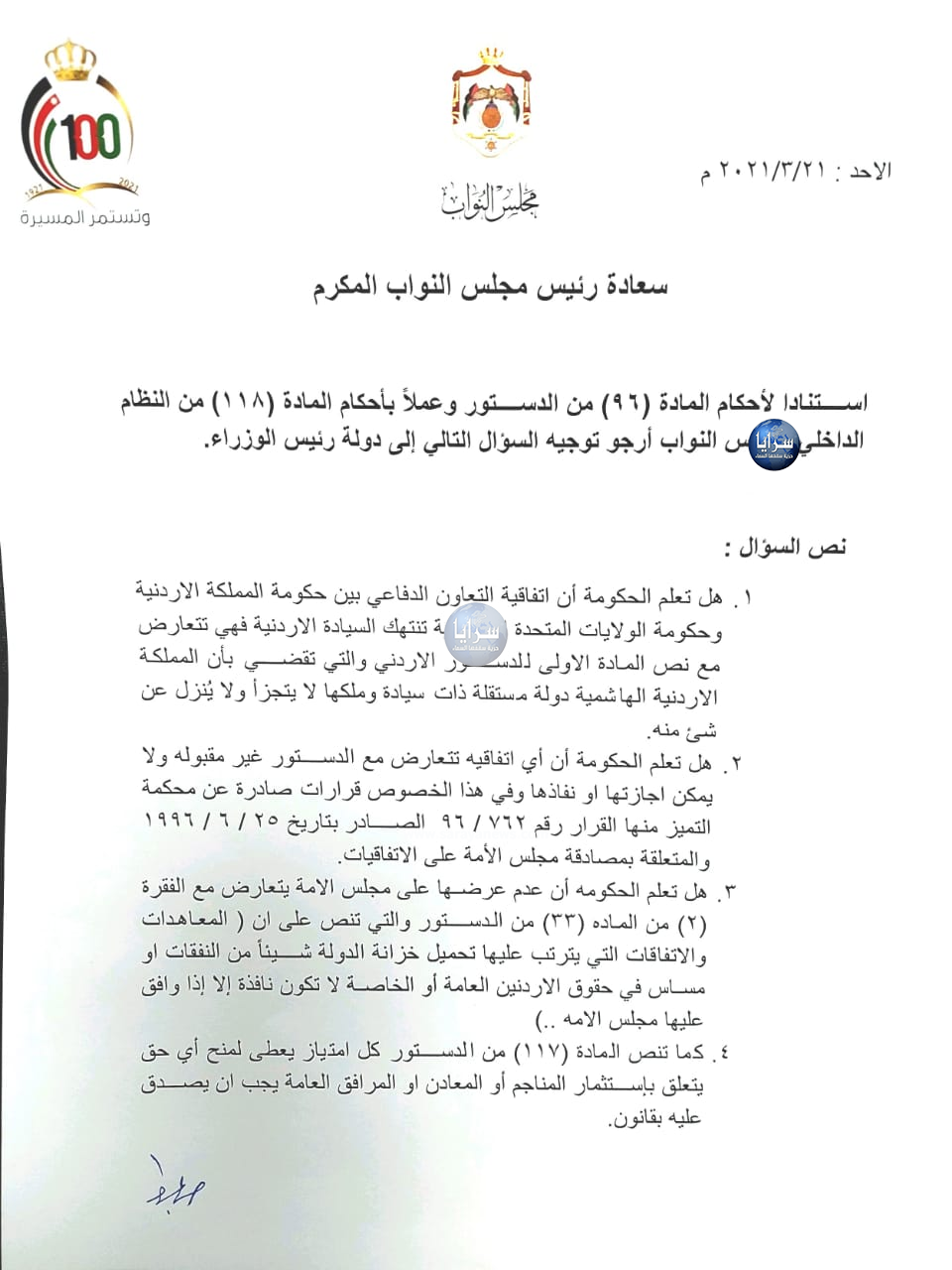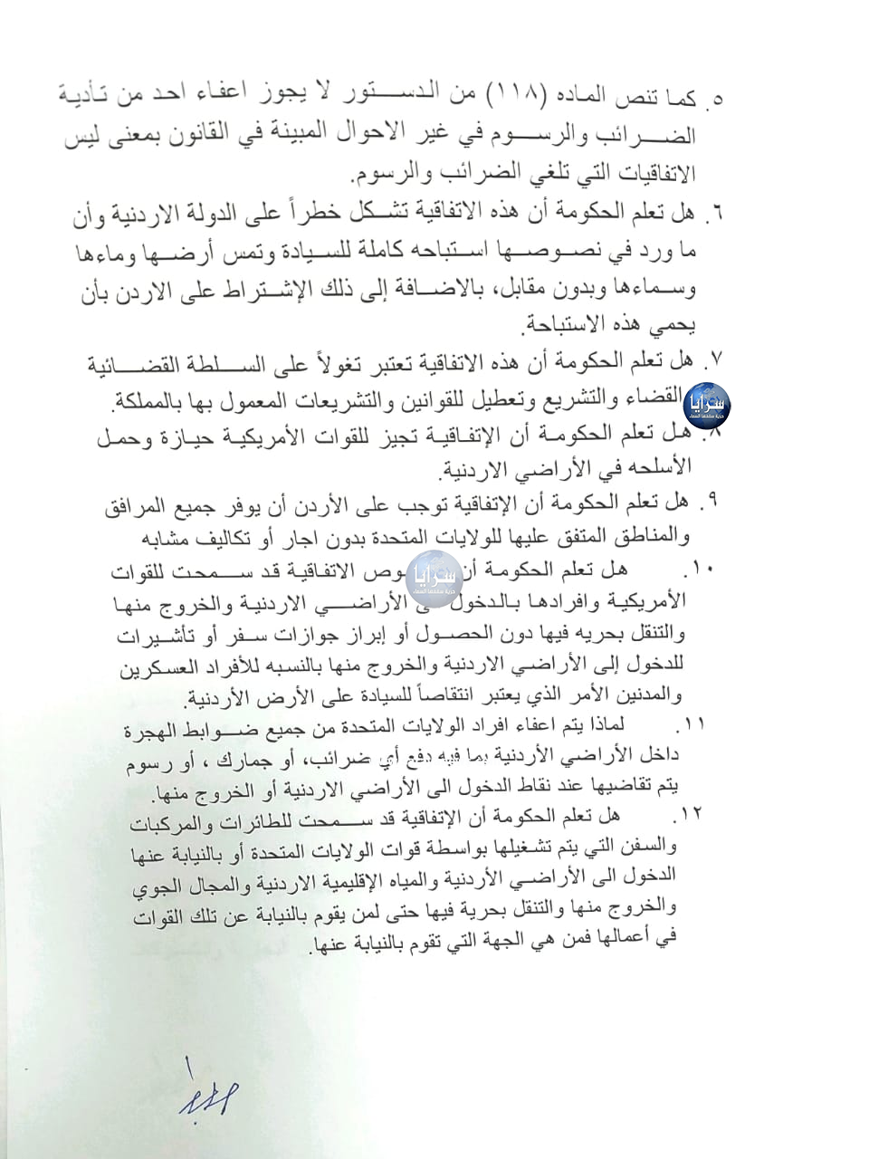 1. هل تعلم الحكومة أن اتفاقية التعاون الدفاعي بين حكومة المملكة الاردنية وحكومة الولايات المتحدة الامريكية تنتهك السيادة الاردنية فهي تتعارض مع نص المادة الاولى للدستور الاردني والتي تقضي بأن المملكة الاردنية الهاشمية دولة مستقلة ذات سيادة وملكها لا يتجزأ ولا يُنزل عن شئ منه.