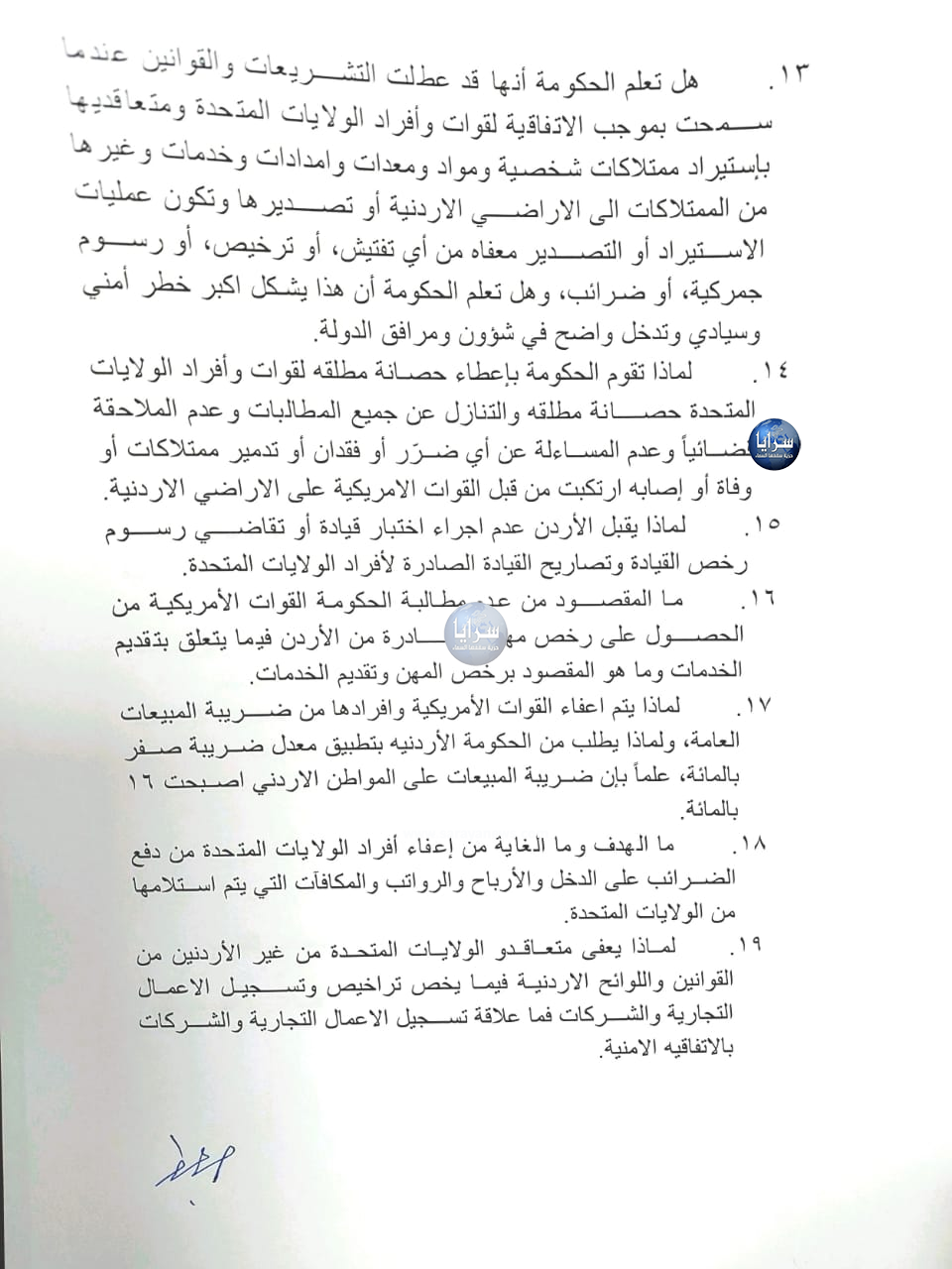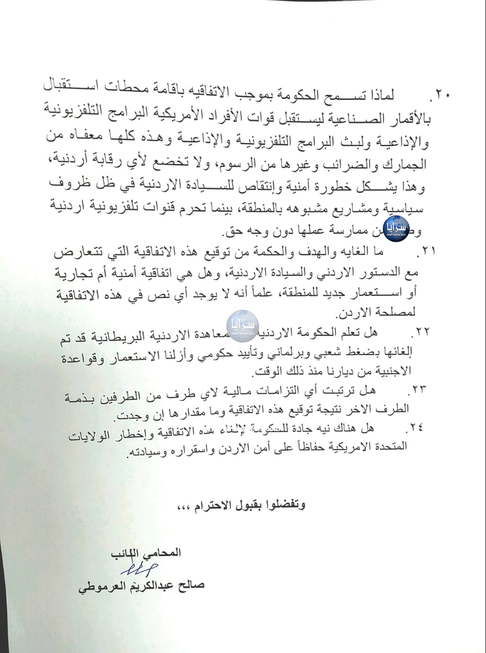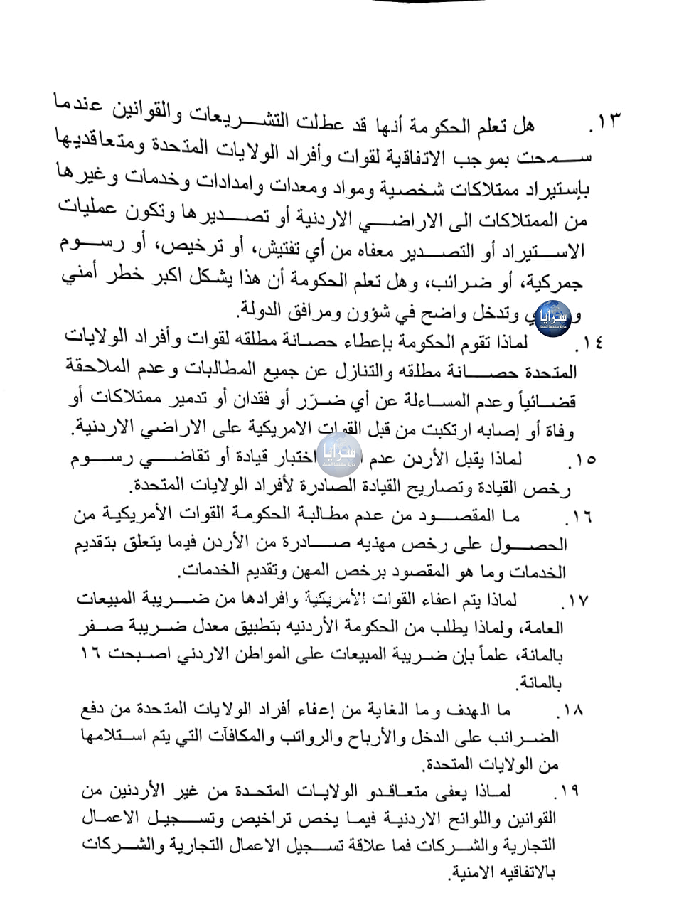 20. لماذا تسمح الحكومة بموجب الاتفاقيه باقامة محطات استقبال بالأقمار الصناعية ليستقبل قوات الأفراد الأمريكية البرامج التلفزيونية والإذاعية ولبث البرامج التلفزيونية والإذاعية وهذه كلها معفاه من الجمارك والضرائب وغيرها من الرسوم، ولا تخضع لأي رقابة أردنية، وهذا يشكل خطورة أمنية وإنتقاص للسيادة الاردنية في ظل ظروف سياسية ومشاريع مشبوهه بالمنطقة، بينما تحرم قنوات تلفزيونية اردنية وطنية من ممارسة عملها دون وجه حق.