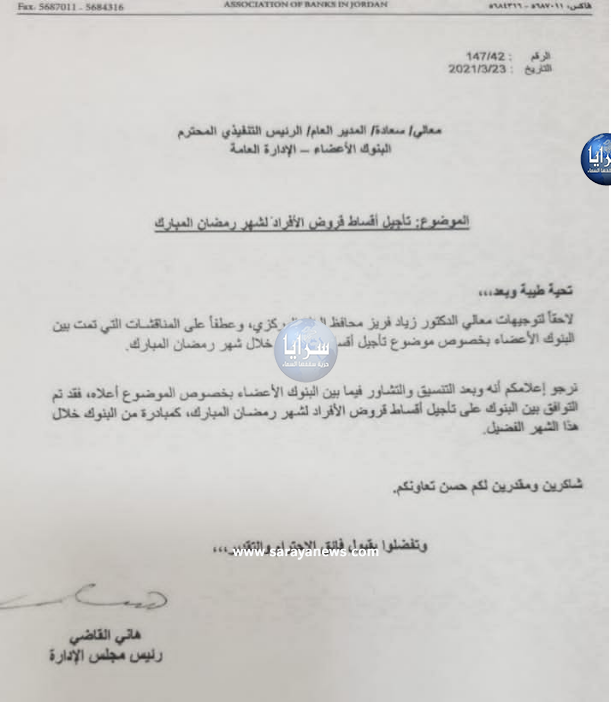 سرايا - ايمن العمري - أكد مدير عام جمعية البنوك في الاردن ماهر المحروق أن هناك توافقاً جرى بين البنوك العاملة في المملكة و البنك المركزي الاردني على تأجيل أقساط البنوك للأفراد خلال شهر رمضان المبارك.