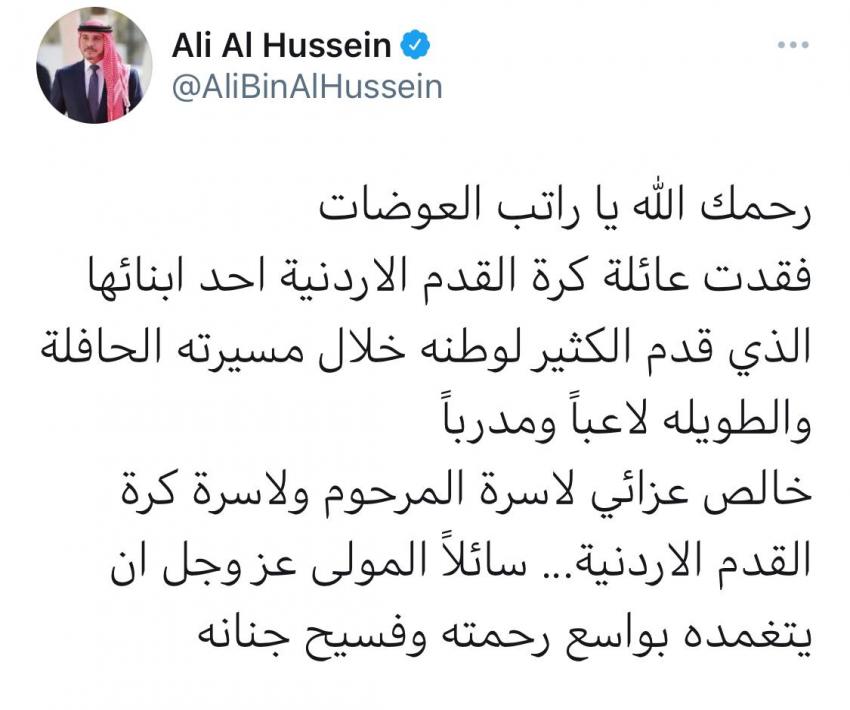 سرايا - نعى سمو الأمير علي بن الحسين رئيس الاتحاد الأردني لكرة القدم، لاعب المنتخب الوطني والمدرب السابق راتب العوضات، الذي انتقل إلى رحمة الله تعالى الجمعة.