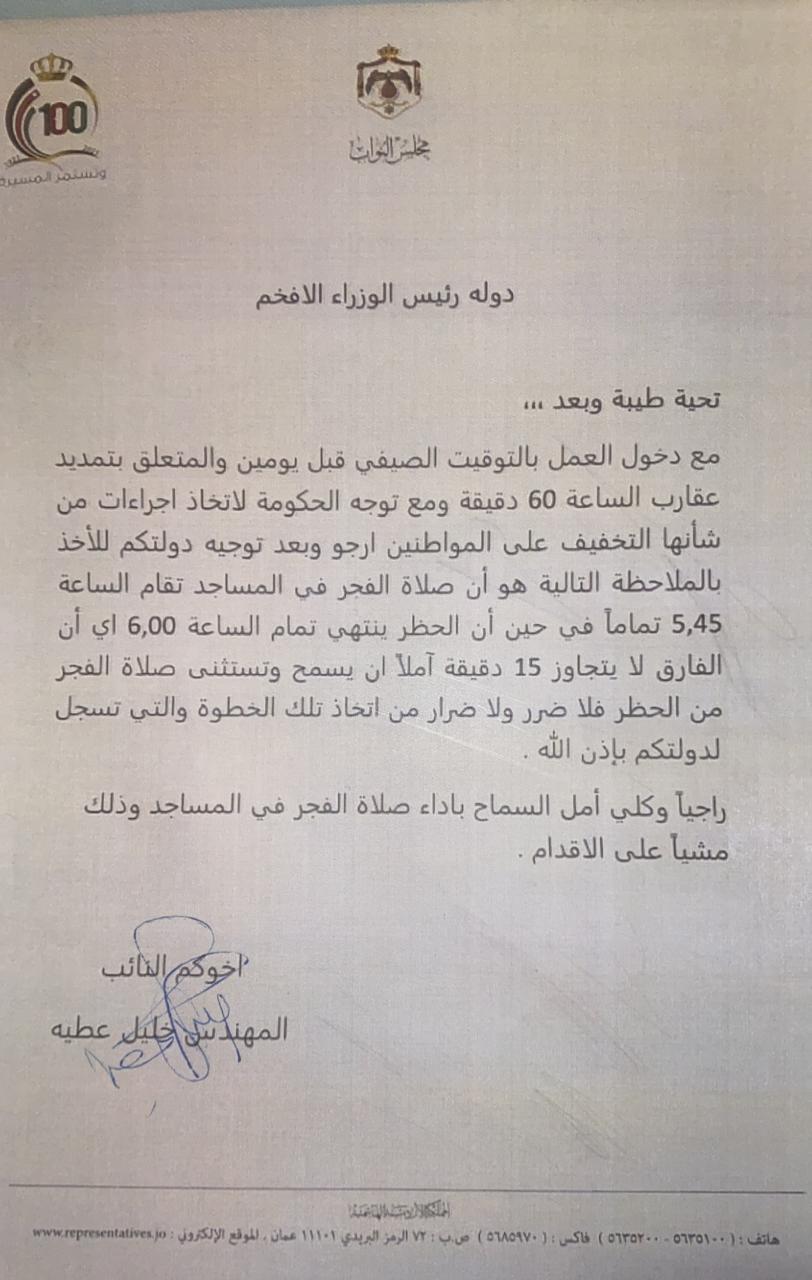 سرايا - وجه النائب خليل عطية كتابا الى رئيس الوزراء بشر الخصاونة يطالب فيه ان تستثنى صلاة الفجر من الحظر خاصة مع دخول التوقيت الصيفي ولا يوجد فرق كبير بوقتها .