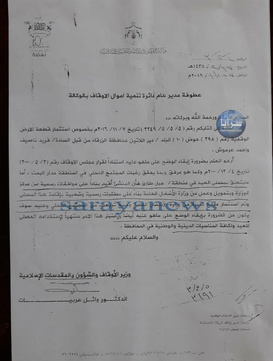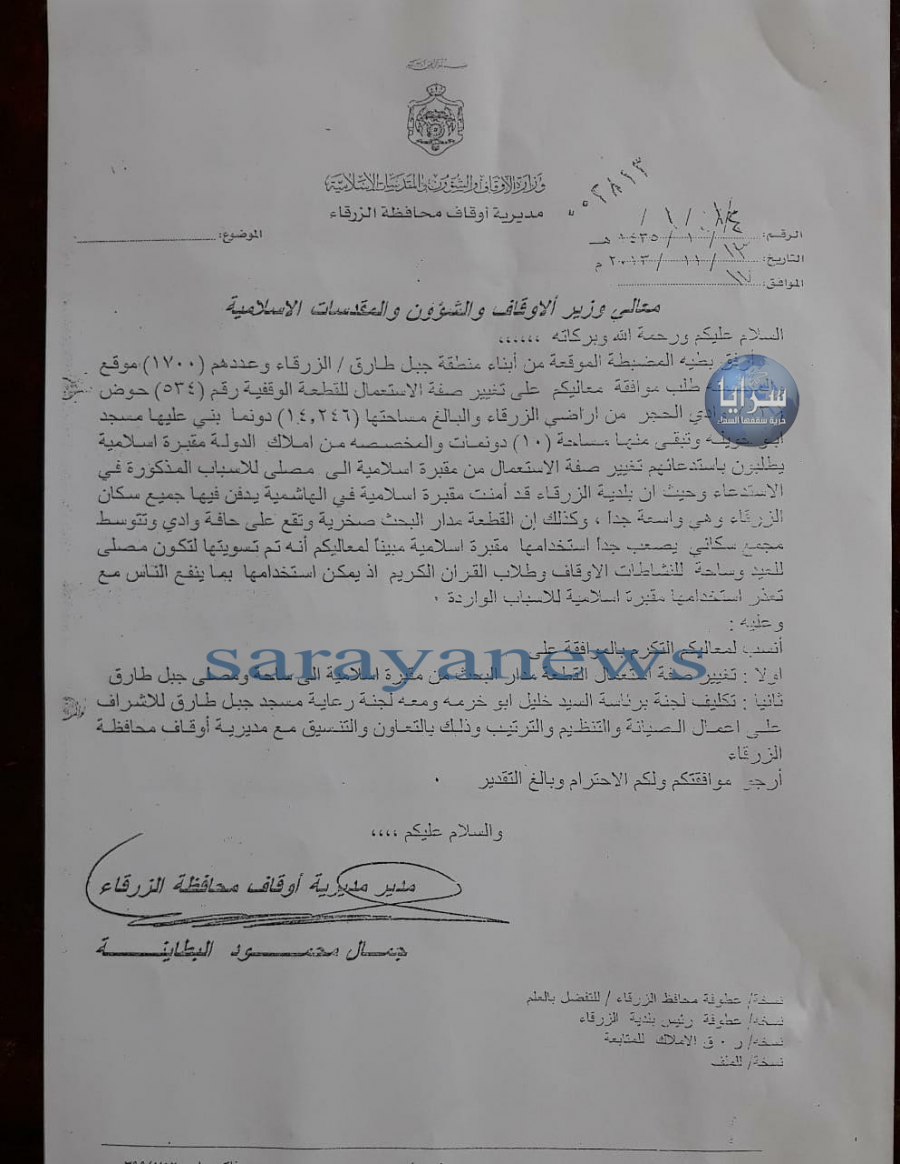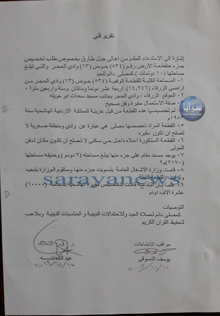 وقال الأهالي في الكتاب الذي وصل سرايا، إن منطقتهم كانت تابعة للتطوير الحضري وكل شيء كان مرسوم بالسم، ولعدم وجود مصلى وساحة للنشاطات الدينية والوطنية، قاموا بالتوجه إلى وزارة الأوقاف لطلب إقامة مصلى لأهالي المنطقة على قطعة أرض أوقفتها خزينة الدولة عام 1983م، كمقبرة لموتى المنطقة؛ كون تركيبتها الصخرية لا تصلح لمقبرة.