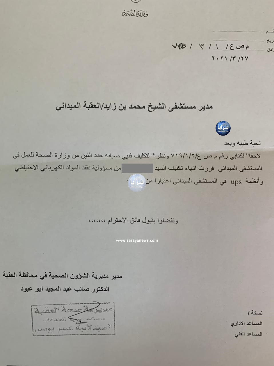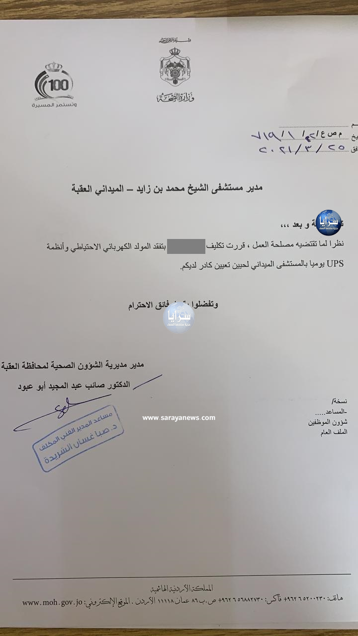 واوضح الحياصات في سرايا ان تكليف الموظف المذكور كان اليوم من واحد فقط ومن ثم اتصل به الموظف الرسمي الذي يتابع تلك المهمه، وابلغه عن رحلته مع والدته تاجلت وسيعود الي عمله في العقبه الجمعة، وعليه فقد ارسل كتابا جديدا الى مدير المستشفى يبلغه فيه بانهاء تكليف مهام الموظف المذكور بسبب عوده الموظف الاصلي الي عمله الجمعة، ووصول موظفين اثنين مكلفين من وزارة الصحة بتلك المهام.