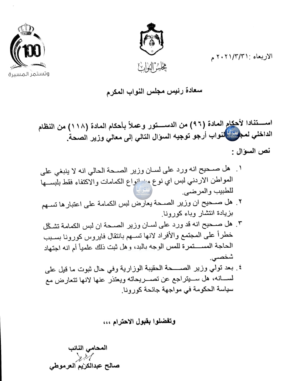 سرايا - وجه النائب صالح العرموطي سؤالاً لرئيس الوزراء بشر الخصاونة حول تصريحات سابقة لوزير الصحة الحالي حينما كان رئيساً للمركز الوطني لمكافحة الأوبئة حول عدم ضرورة لبس الكمامة في مكافحة وباء كورونا.