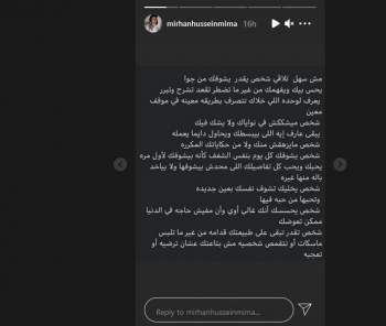 وتابعت ميرهان: "شخص يخليك تشوف نفسك بعين جديده شخص يحسسك أنك غالي أوي وأن مفيش حاجه في الدنيا ممكن تعوضك ، شخص تقدر تبقى على طبيعتك قدامه من غير ما تلبس ، ماسكات أو تتقمص شخصيه مش بتاعتك عشان ترضيه أو تعجبه".