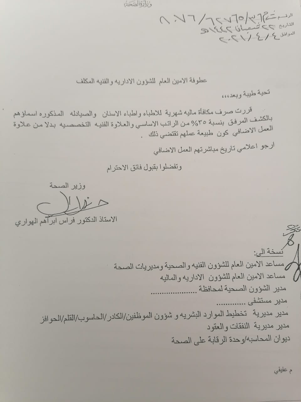 سرايا - قرر وزير الصحة فراس الهواري صرف مكافأة مالية شهرية لأطباء وأطباء أسنان وصيادلة بنسبة 35 بالمئة من الراتب الأساسي والعلاوة الفنية التخصصية بدلا من علاوة العمل الإضافي كون طبيعة عملهم تقتضي ذلك.