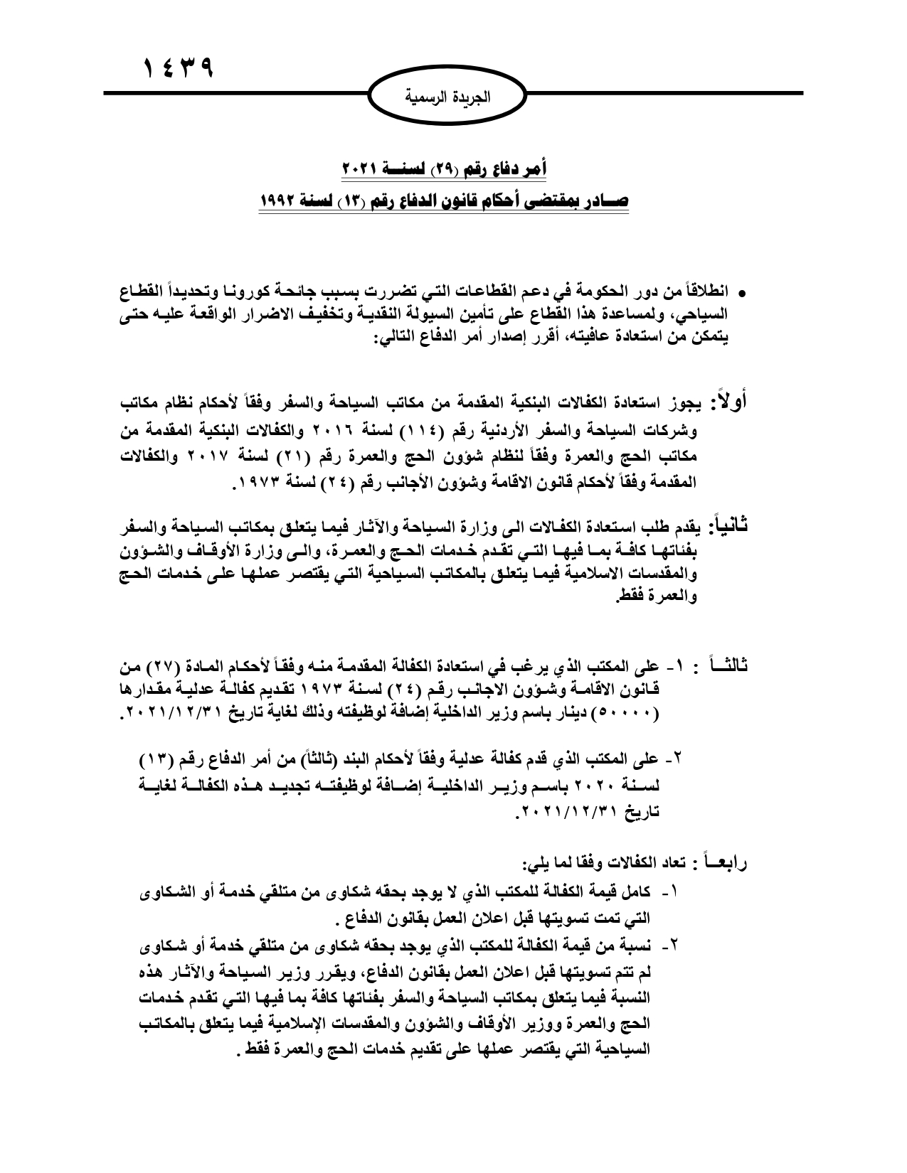 ويتضمن أمر الدفاع 29، تعليمات جديدة لدعم القطاع السياحي والذي تضرر بسبب كورونا، حيث تدعم هذه التعليمات تأمين سيولة نقدية للقطاع للتخفيف من الأضرار الواقع عليه حتى يتمكن من استمرار عافيته.