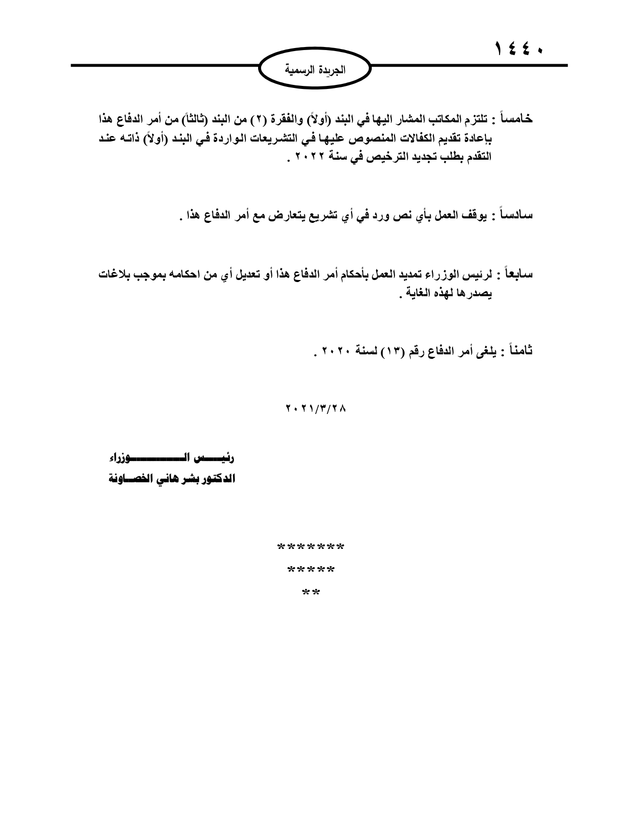 سرايا - أصدر رئيس الوزراء الدكتور بشر الخصاونة، اليوم الأربعاء، أمر دفاع رقـم (29) لسنــة 2021 والصـادر بمقتضى أحكام قانون الدفاع رقم (13) لسنة 1992.