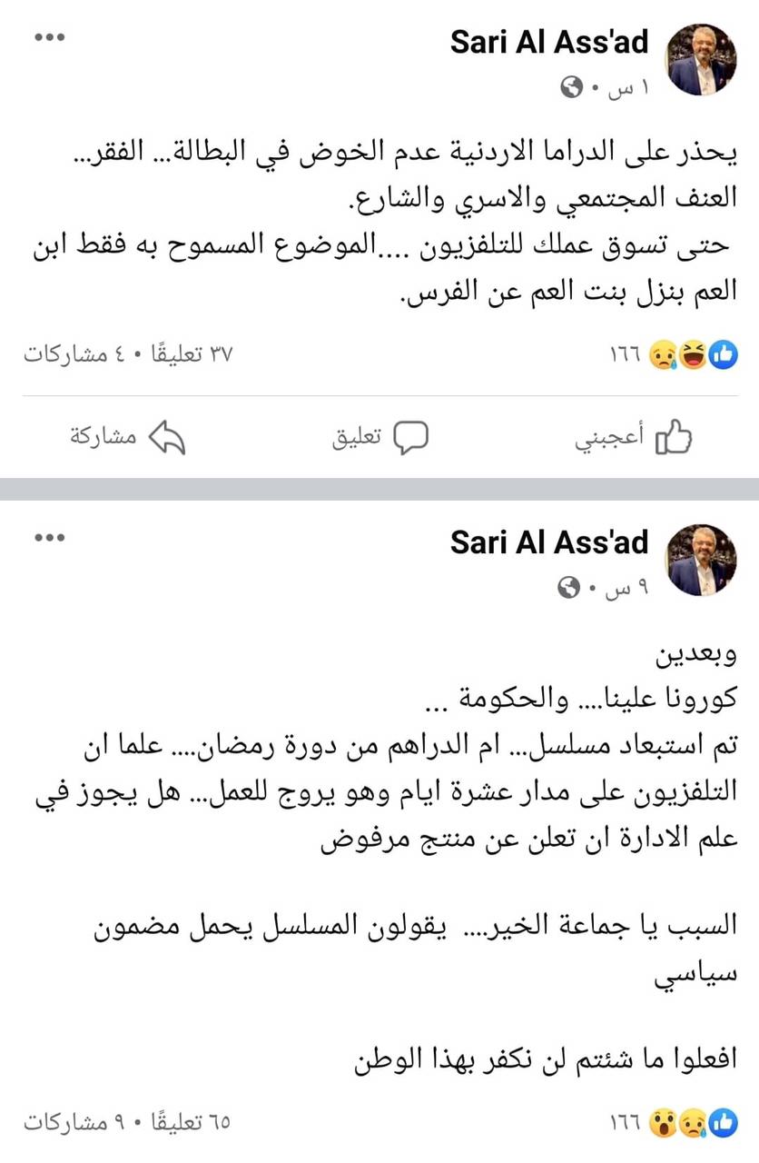 سرايا - رصد - نشر نقيب الفنانين السابق، الفنان ساري الاسعد، عبر صفحته على الفيسبوك، ان التلفزيون الاردني اوقف عرض مسلسل "ام الدراهم" خلال دورة شهر رمضان التلفزيونية.