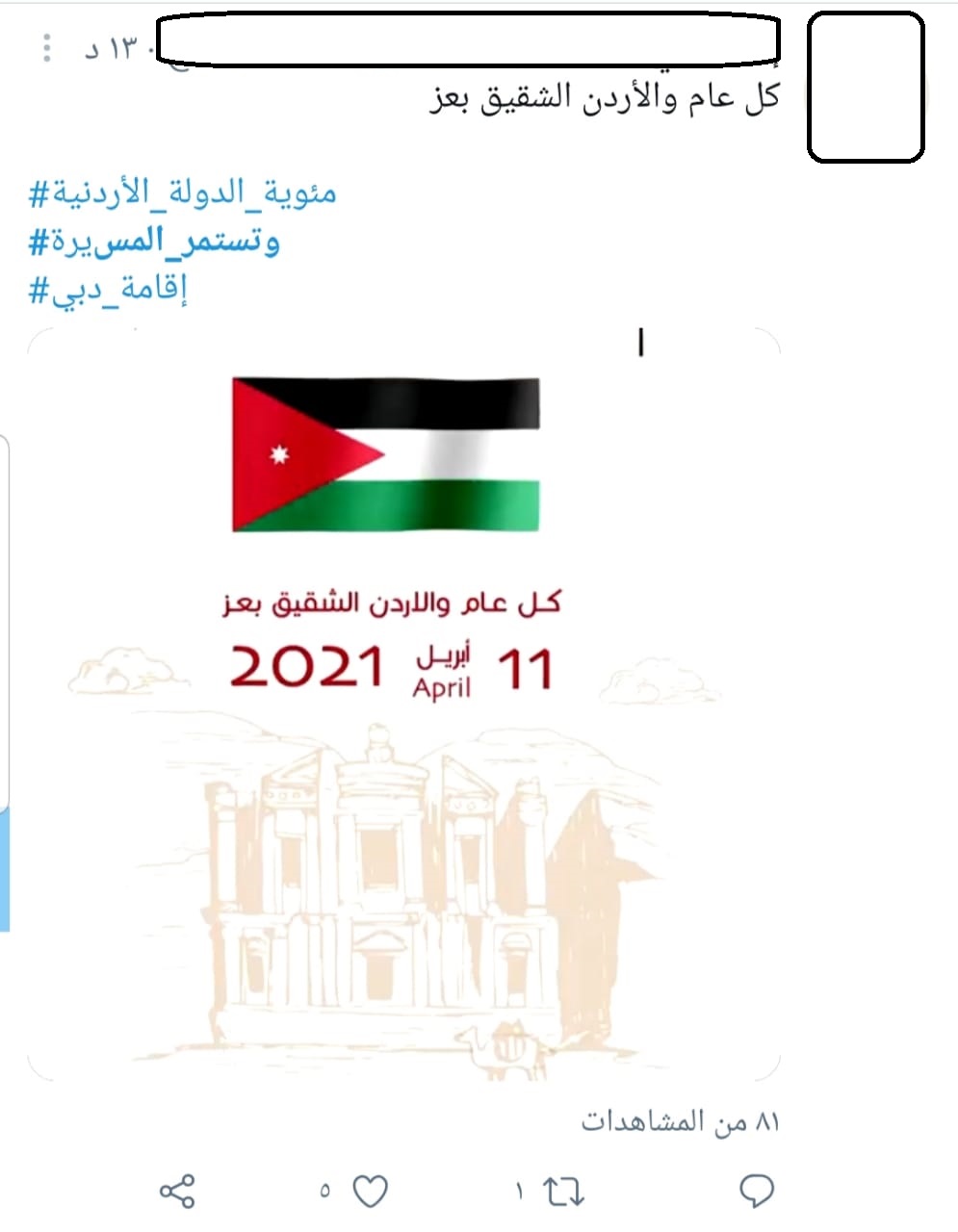 وتبادل النشطاء التهنئات بهذه المناسبة العظيمة التي ترمز لقوة هذه الدولة التي مرت عبر الـ100عام، بعواصف وزلازل لم تزعزع قوة وإرادة شعبها العظيم أمام جميع التحديات، الأمر الذي يبعث الفخر لكل من كان مسقطه على تراب هذه الأرض الطهور، أرض الحشد والرباط.