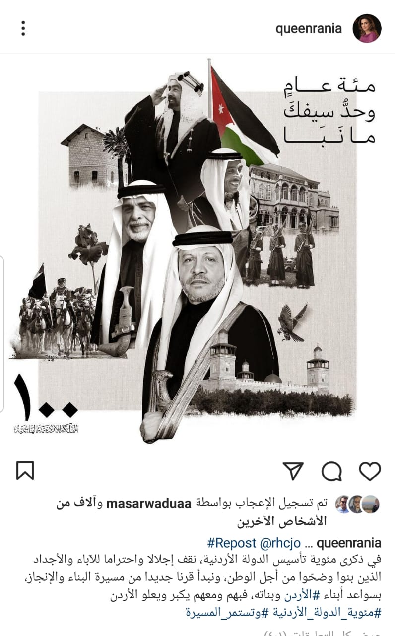 وقالت جلالتها في تدوينة عبر حسابها بإنستغرام، “في ذكرى مئوية تأسيس الدولة الأردنية، نقف إجلالا واحتراما للآباء والأجداد الذين بنوا وضحّوا من أجل الوطن”.