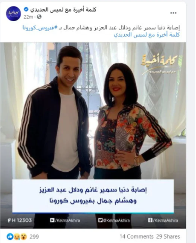 وكانت أكدت الفنانة نهال عنبر، المسؤولة عن ملف الصحة في نقابة المهن التمثيلية، ما تردد بشأن إصابة الفنانةدنيا سمير غانم والفنانة دلال عبدد العزيز والفنان هشام جمال بفيروس كورونا.