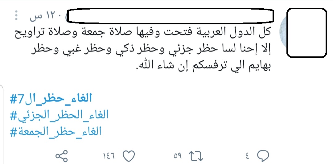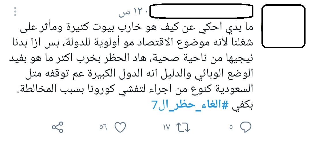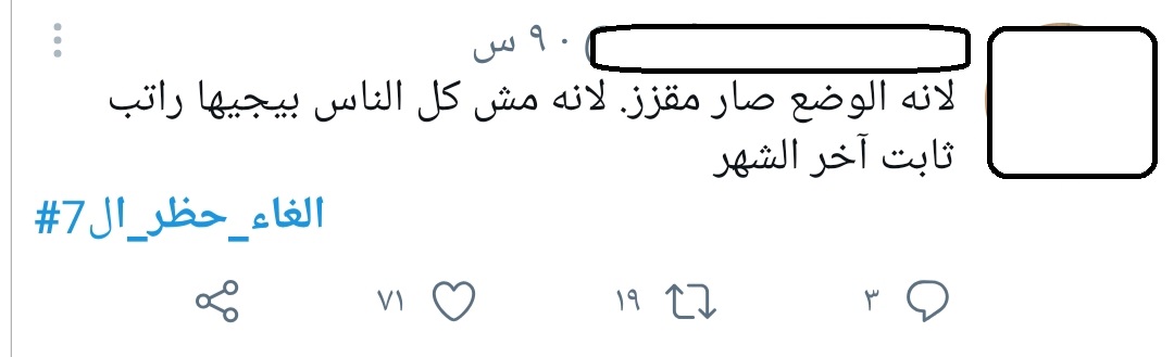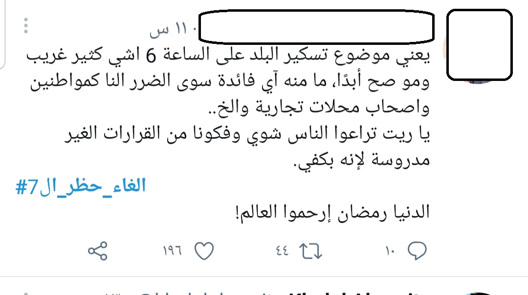 وعبر المغردون عن غضبهم من الحظر الليلي الذي يبدأ الساعة الـ7، حيث انعكس على العديد من المواطنين في أرزاقهم وصحتهم النفسية، بحسب تعبيرهم، مطالبين بسرعة الرجوع عن هذا القرار لإنقاذ العديد ممن تقطعت ارزاقهم، التي كانت تعتمد بشكل كلي على الوقت المسائي، إضافة للعديد من القطاعات التي أفلست وترتبت عليها خلال هذا الإجراء تراكمات مالية كبيرة.