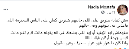 وردت نادية في منشور على صفحتها في "فيسبوك" أن رامزا سخر ممن يجلسون في منازلهم وتخطى الحدود بسخريته غير اللائقة.