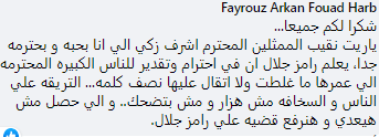 وكتبت في منشورها: "ياريت نقيب الممثلين المحترم أشرف زكي، الذي أنا أحبه وأحترمه جدا، يعلم رامز جلال إن في احترام وتقدير للناس الكبيرة المحترمة اللي عمرها ما غلطت ولا اتقال عليها نصف كلمة.. السخرية من الناس والسخافة ليست هزارا ولا تضحك".