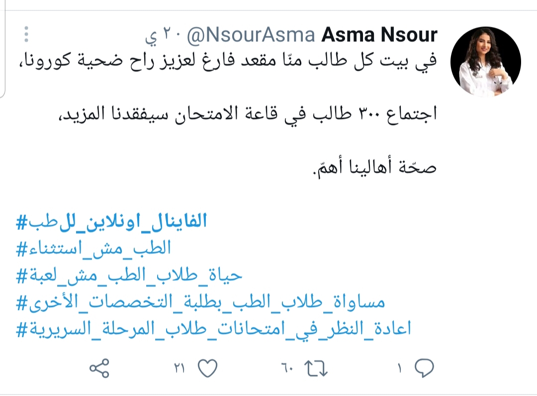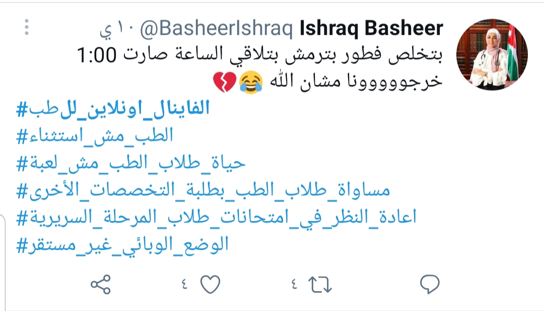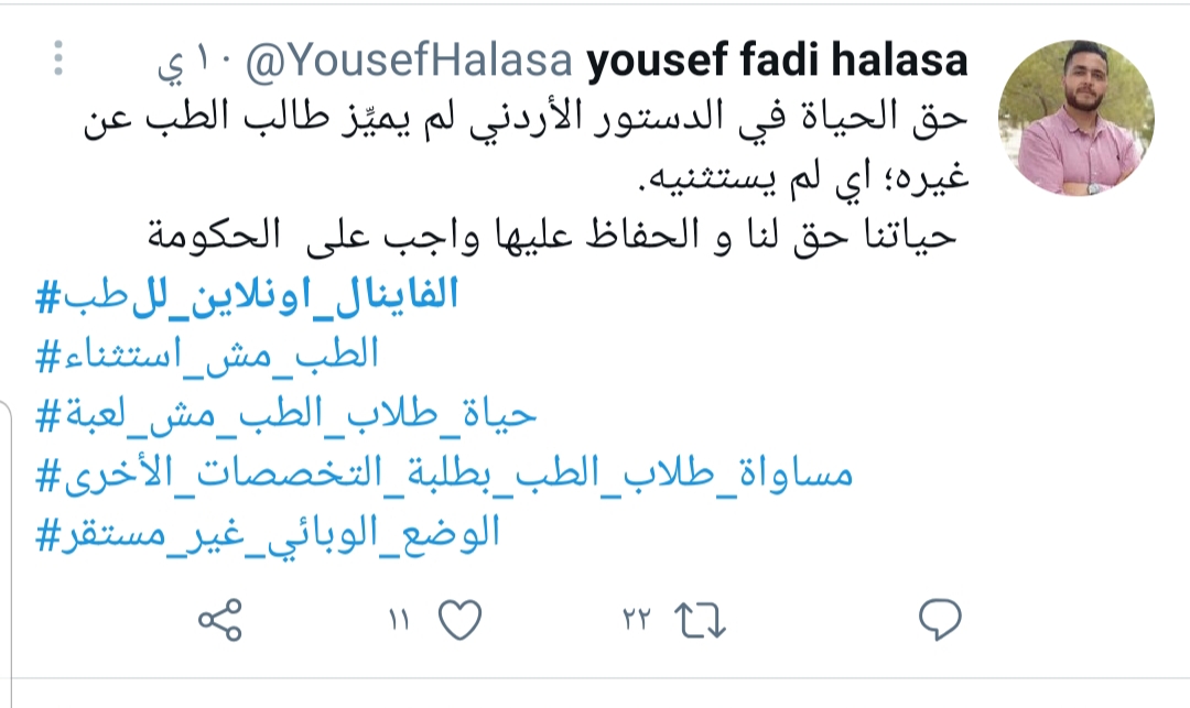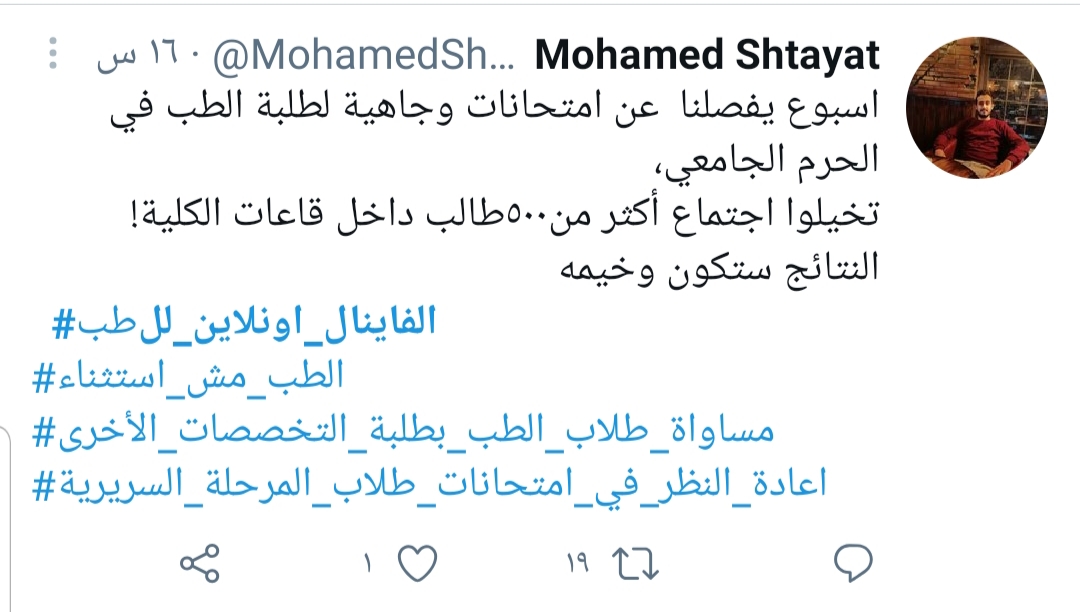 سرايا - أحمد الجراح - أطلق طلبة كليات الطب ومناصرين لهم في الجامعات الأردنية هاشتاغ "الفاينال أون لاين للطب" و"ناجح راسب من حقي"، تعبيرا عن رفضهم لقرارات وزارة التعليم العالي المتعلقة بامتحان الفاينال تزامنا مع كورونا.