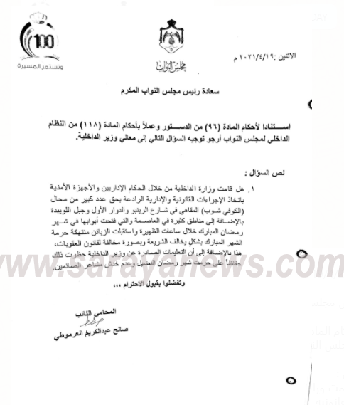 سرايا - وجه النائب صالح العرموطي سؤالباً نيابياً لوزير الداخلية، يستفسر فيه عن إجراءات الوزارة و الجهات التابعة لها، بالتعامل مع المقاهي التي فتحت بنهار رمضان و استقبلت الزبائن و تجاوزت حرمة شهر رمضان الفضيل و خدشت مشاعر الصائمين.