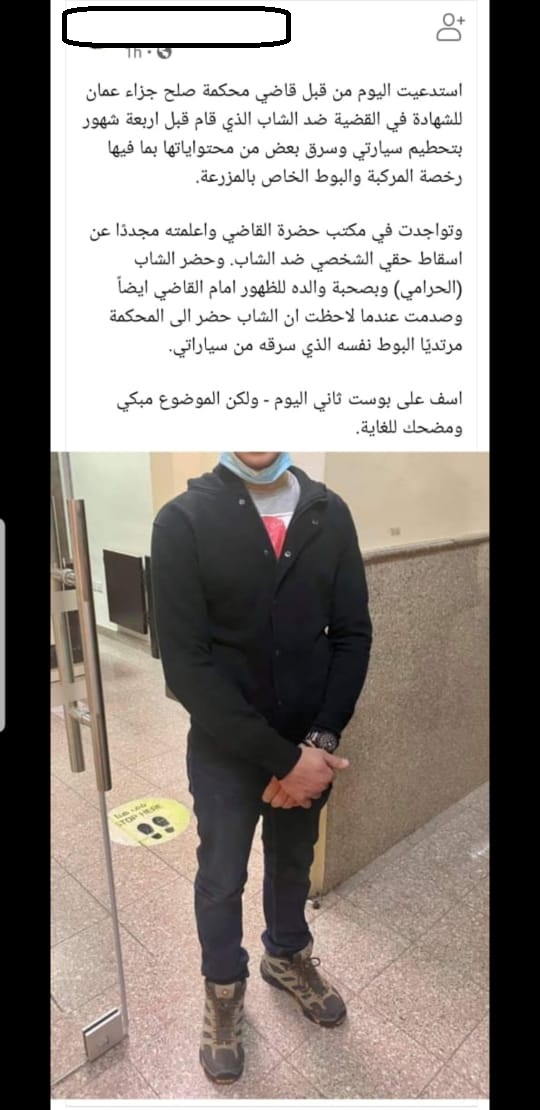 وقال الشاب الذي أسقط حقه عبر حسابه الخاص على الفيسبوك، إنه وبعد ان استدعي من قبل القاضي للمحكمة للشهادة في القضية ضد الشاب، الذي قام قبل أربعة شهور بتحطيم زجاج مركبته وسرقة محتوياتها، وبحضور المتهم ووالده تفاجئ صاحب المركبة أن المتهم يرتدي حذائه المسروق داخل المحكمة، الأمر الذي أثار استهجانه واللامبالاة لدى المتهم.