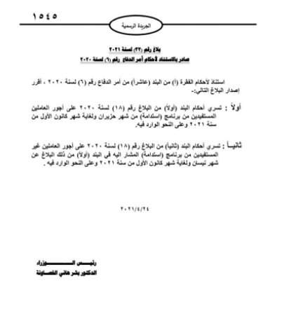 سرايا - أصدر رئيس الوزراء الدكتور بشر الخصاونة البلاغ رقم (٣٢) لسنة ٢٠٢١م المتعلّق بمدد سريان برنامج (استدامة) على أجور العاملين المستفيدين منه.