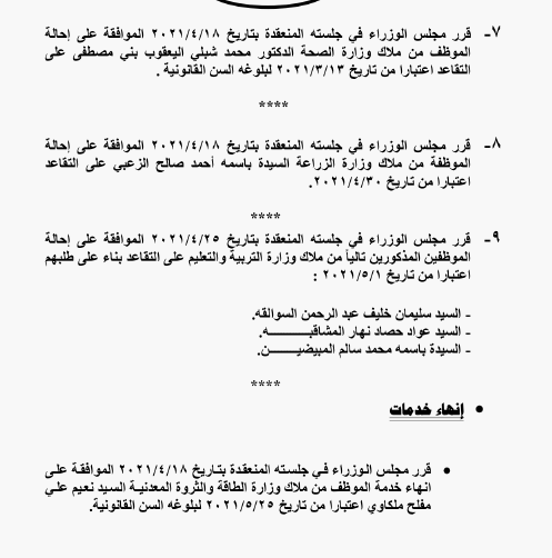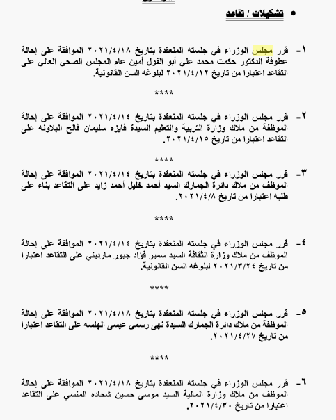 سرايا - قرر مجلس الوزراء، إحالة عدد من الموظفين في وزارات ومؤسسات حكومية الى التقاعد وانهاء خدمات آخرين.