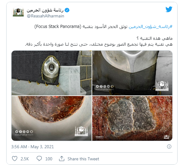 سرايا - أعلنت الرئاسة العامة لشؤون المسجد الحرام والمسجد النبوي، اليوم الاثنين، أنها قامت بتوثيق صور الحجر الأسود بتقنية "Focus Stack Panorama".