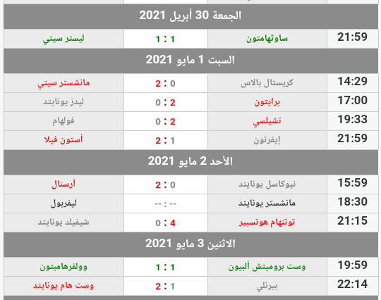 سرايا - اختتمت بالأمس مباريات الجولة الرابعة والثلاثين من عمر بطولة الدوري الإنجليزي الممتاز لكرة القدم للموسم الحالي 2020 / 2021 بمباراة وست هام ضد بيرنلي التي انتهت بفوز وست هام بهدفين لهدف .