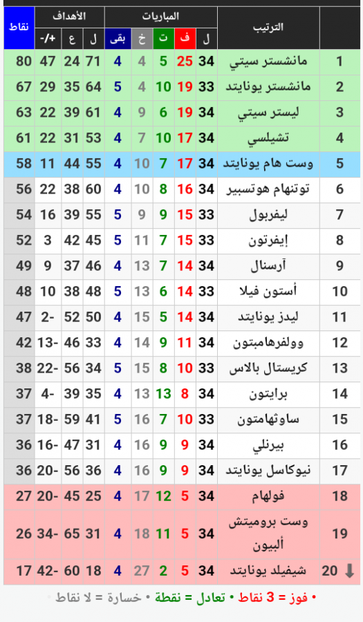 بينما يأتي فريق وست هام في المركز الخامس برصيد 58 نقطة جمعها من الفوز في 17 مباراة والتعادل في 7 وخسارة 10 لقاءات وسجل 53 هدفاً وتلقى 43.