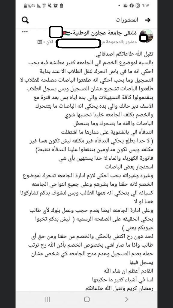 واضاف الطلبة لسرايا بأن رسوم الخدمات التي تاخذها الجامعة غير منصفة، متسائلين لماذا على الطالب ان يدفع بدل خدمة لم يتلقاها، ولم يتم استخدام اي من مرافق الجامعة، ولم يستخدم وسائل النقل الخاصة به إلا وقت التسجيل، حيث التعلم كان في الفصل الماضي والمقبل"الصيفي" عن بعد، مما يفقد الجامعة الحق في هذه المبالغ المالية المطلوبة.