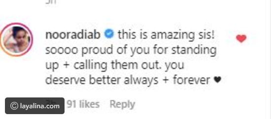 كما دعمت نور عمرو دياب أختها جانا قائلة إنها فخورة بها قائلة: "هذا رائع يا أختي! فخورة جدًا بكِ لوقوفك والمناداة بهم، أنتي تستحقين الأفضل دائمًا وإلى الأبد".