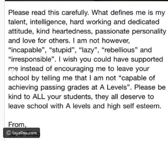 اختتمت جانا دياب رسالتها قائلة: "رجاء اقرأوا ذلك بحرص، ما يعرفني هو موهبتي، ذكائي، عملي الشاق وطيبة قلبي وشخصيتي الشغوفة وحبي للآخرين، أنا مع ذلك لست غير قادرة، غبية، كسولة، متمردة وعديمة مسئولية، أتمنى لو كنتم دعمتموني بدلا من تشجيعي على مغادرة مدرستكم بإخباري أنني غير قادرة على تحقيق درجات عالية للنجاح، أرجوكم كونوا طيبين مع كل تلاميذكم لأنهم يستحقون مغادرة المدرسة بدرجات عالية وكذلك ثقة كبيرة في النفس".