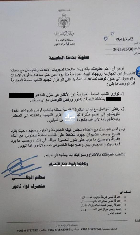 سرايا - وجه متصرف لواء ناعور، سطام المجالي كتابا رسميا لمحافظ العاصمة عمّان، يطلعه فيه على آخر مستجدات ومجريات الأحداث والتواصل مع النائب فراس العجارمة ووجهاء قبيلة العجارمة، في محاولة لوقف تصاعدات المشهد على إثر قرار مجلس النواب تجميد عضوية النائب أسامة العجارمة.