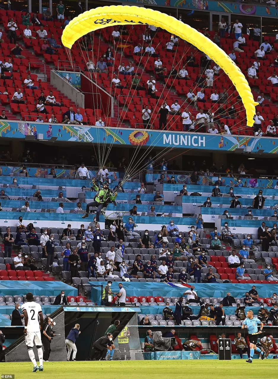 سرايا - نُقل شخصان على الأقل إلى المستشفى، مصابين بجروح في الرأس أمس، بسبب هبوط شراعي فاشل، أدى لاصطدام أحد ممثلي منظمة السلام الأخضر بالمشجعين في المدرجات، قبل قمة ألمانيا وفرنسا في كأس الأمم الأوروبية "يورو 2020"، والتي انتهت لمصلحة فرنسا بهدف وحيد.