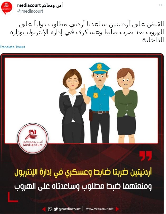 وبحسب ما أورده حساب ”أمن ومحاكم“ المحلي في الكويت، فقد قامت المتهمتان بمساعدة مطلوب دولي، أردني الجنسية، على الهرب، وذلك بعد قيامهما بضرب ضابط وعسكري من إدارة ”الإنتربول“ في وزارة الداخلية.