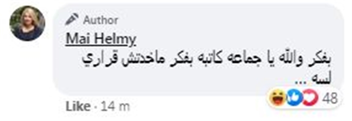 تلقت مي حلمي بعض التعليقات التي طالبها أصحابها بالتراجع عن قرار الاعتزال، لتؤكد أنها لم تحسم رغبتها بعد، وردت: "بفكر والله يا جماعة كاتبة بفكر ماخدتش قراري لسه".
