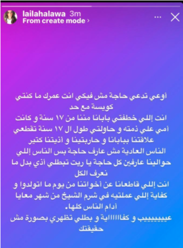 وكتبت ليلى حلاوة، قائلة: "اوعى تدعى حاجة مش فيكى عمرك ما كنتى كويسة مع حد، إنتى اللى خطفتى بابا مننا .. من 17 سنة وماما على ذمته ومن 17 سنة حاولتى تقطعى علاقتنا ببابا وحاربتينا وأذتينا كتير .. الناس العادية مش عارفة حاجة بس الناس اللى حوالينا عارفين كل حاجة ياريت تبطلى أذى بدل ما نعرَّف الكل".