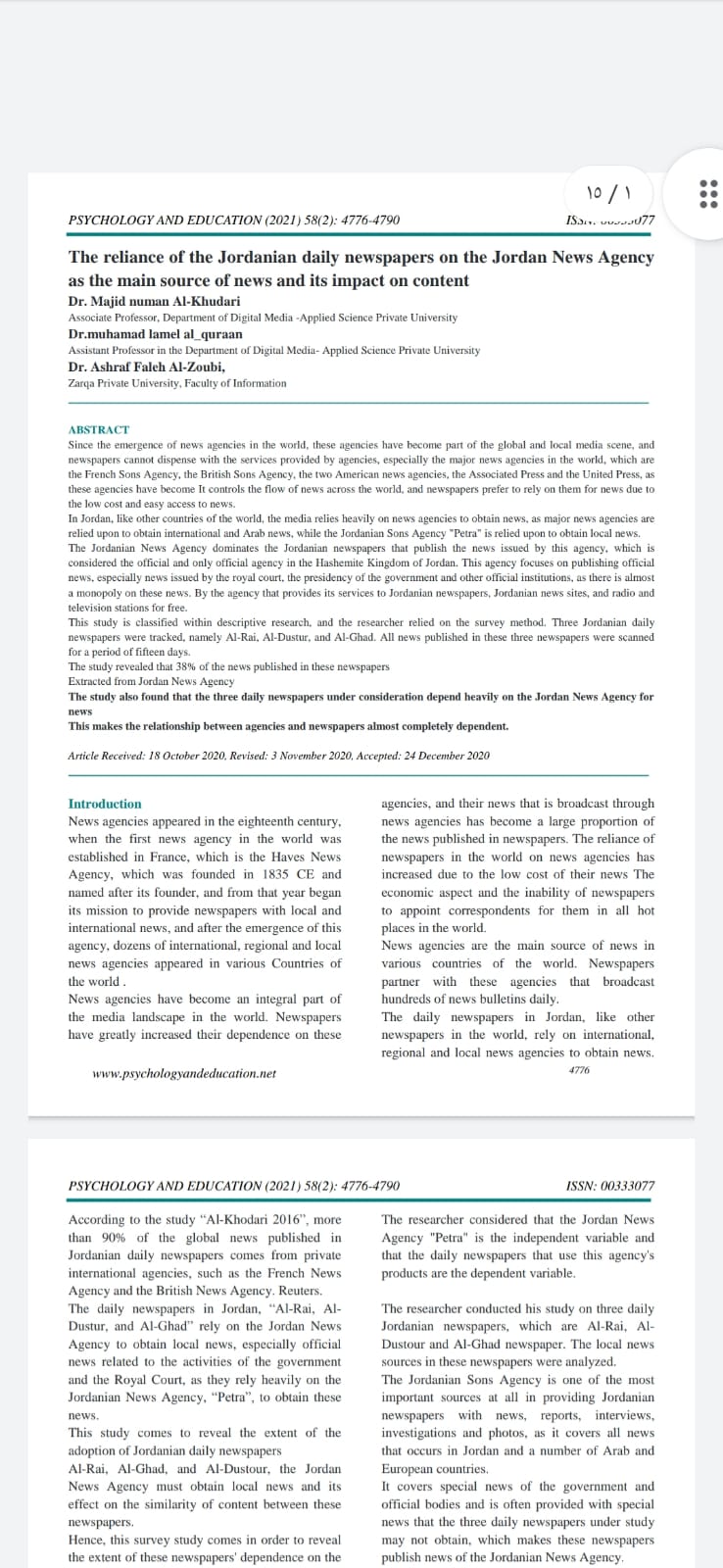 خلصت دراسة أجراها الدكتور ماجد الخضري أستاذ الإعلام الرقمي في جامعة العلوم التطبيقية والدكتور محمد القرعان استاذ الإعلام في جامعة العلوم التطبيقية والدكتور اشرف الزعبي من كلية الإعلام في جامعة الزرقاء ونشرت في مجلة علم النفس والتعليم الامريكية الى ان الصحف اليومية الرئيسة الثالث في الأردن وهي الراي والغد والدستور ما زالت تعتمد