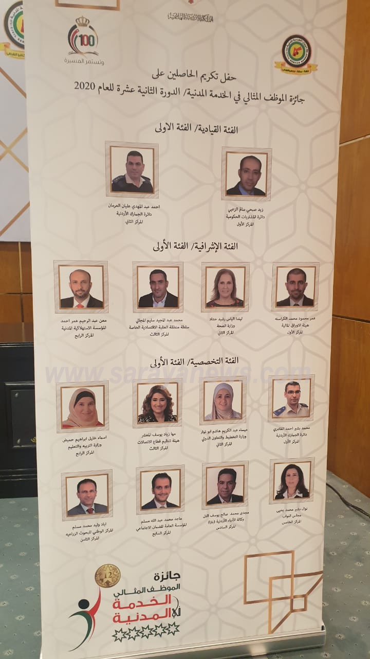 وشكر الخصاونة على اهتمامه وحرصه لرعايته حفل تكريم الحاصلين على جائزة الموظف المثالي في الخدمة المدنية، و تالياً الأسماء المُكرمة: